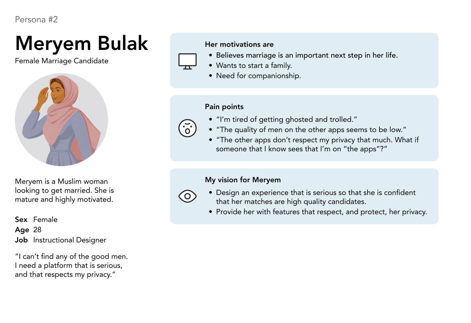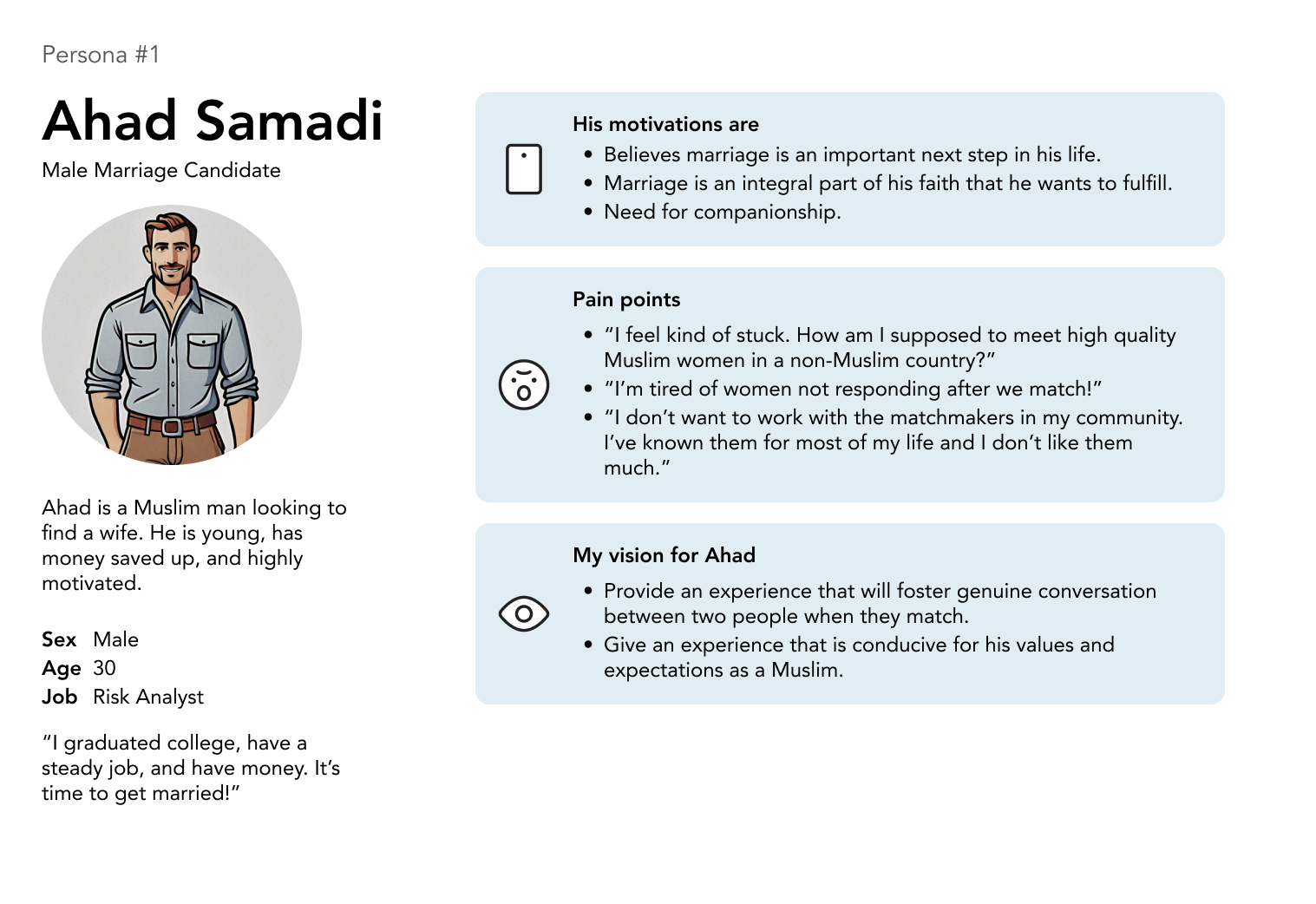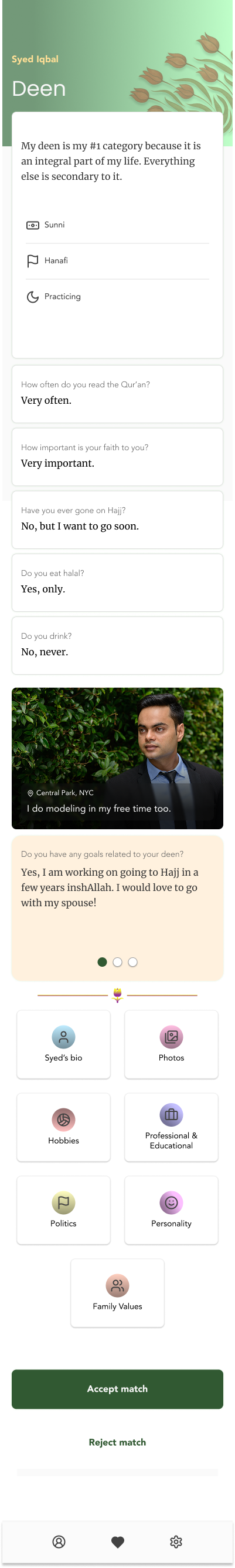 Our team saw a problem in the Muslim community in NYC: many Muslims struggle to find suitable partners for marriage, and many of these candidates express frustration with contemporary solutions designed to help Muslims get married.