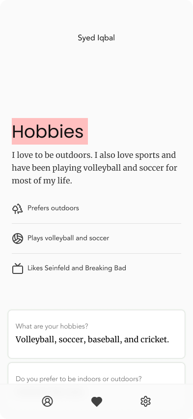 I then asked matchmakers in my community to serve as SMEs for Deeny’s design journey. I also interviewed potential users and extracted a plethora of information via user interviews and surveys.