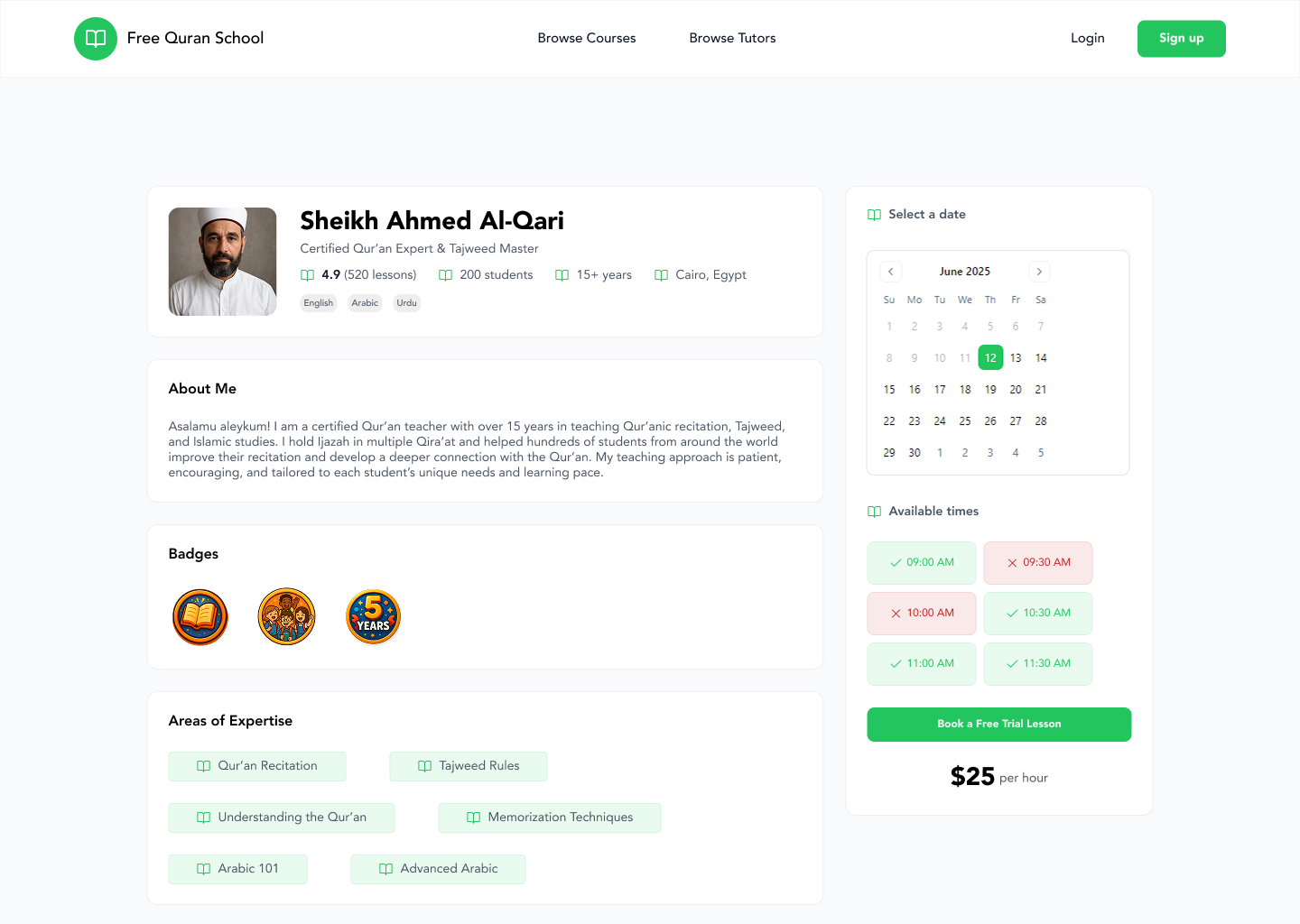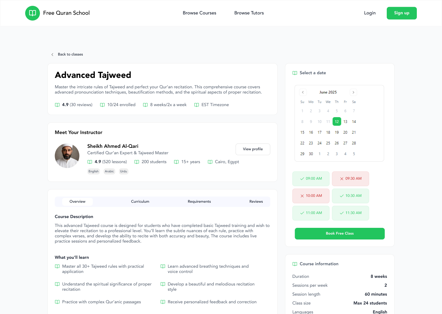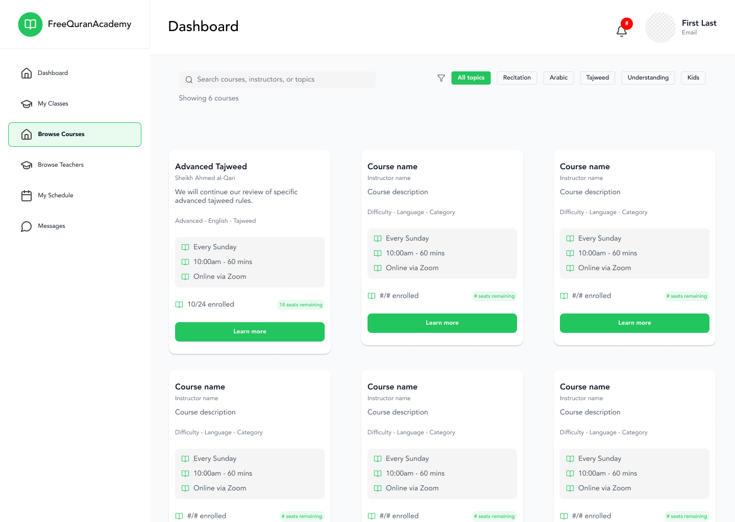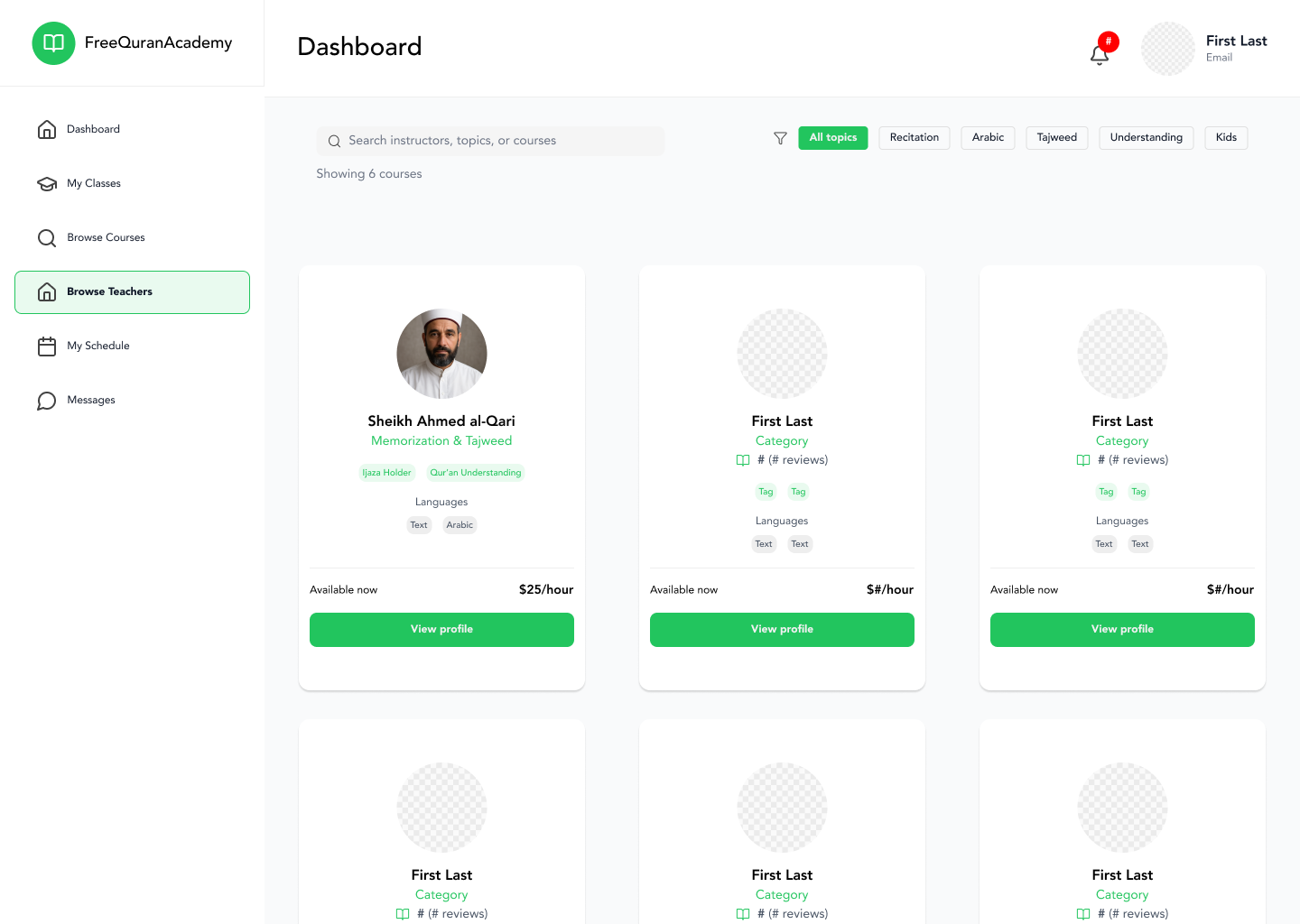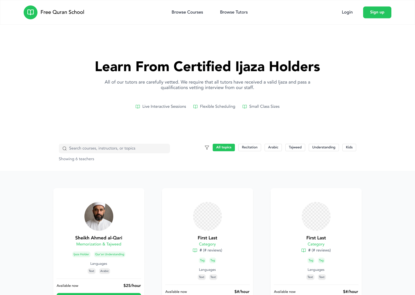 A platform that encourages certified Qur’an teachers to sign up and teach students for free with the added incentive of allowing them to earn money via private courses.