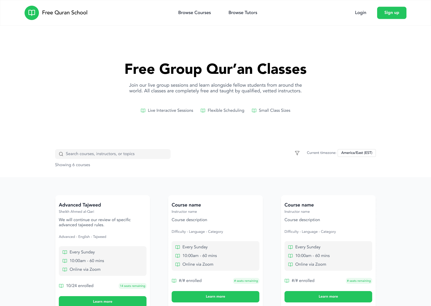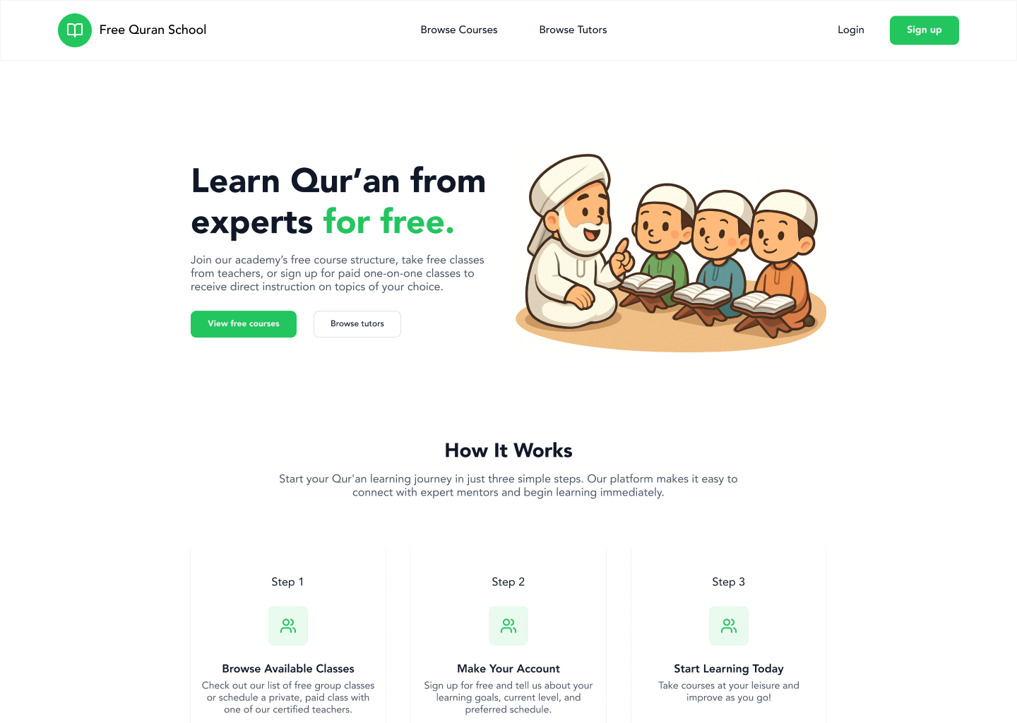 Thus the goal came to scale the project. I was recruited to lead the design of the next level for Ouyoun Academy, a platform where anyone could sign up and learn the Qur’an for free. We decided to change Ouyoun’s name to FreeQuranSchool.com: a direct and immediate value proposition for all to see.